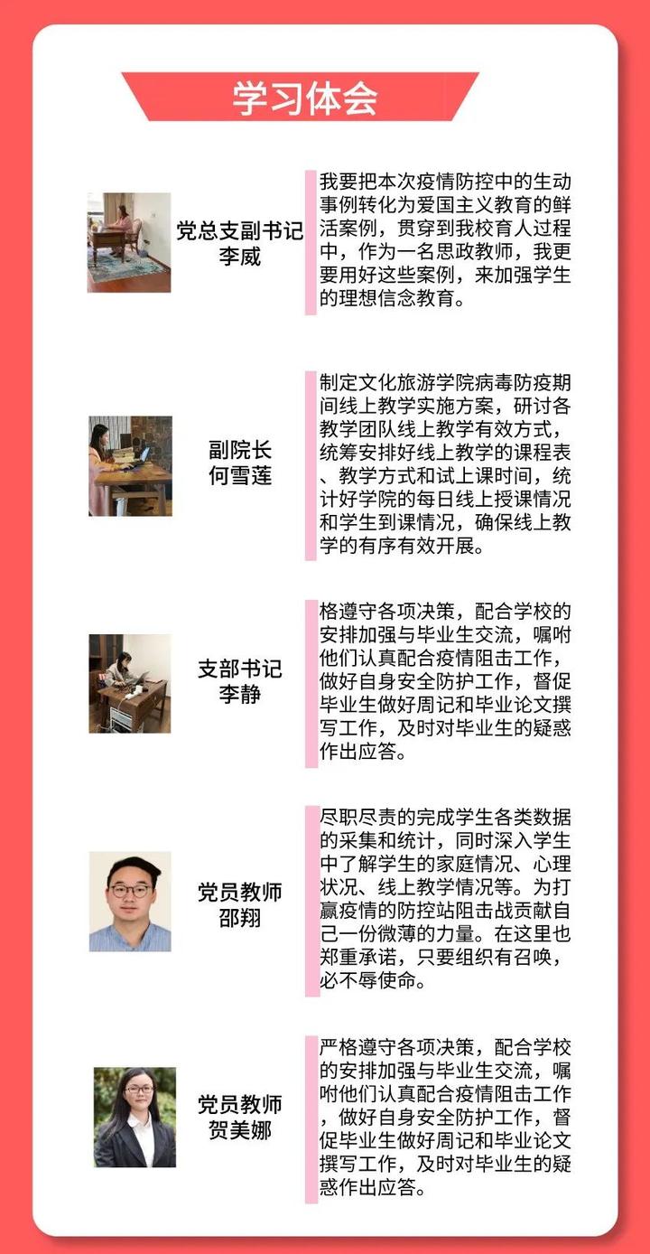 通过学习,激励了党员教师明确“守土有责、守土担责、守土尽责”的意识,通过抗击疫情期间关心关爱员工健康、完善线上授课等方式作为践行初心使命的“主战场”。同时也要落实好“停课不停学,停课不停教”的要求,充分利用网络平台开展教学、答疑辅导等活动,实现“抗疫”与“育人”两不误。大家一致坚信,在以习近平同志为核心的党中央坚强领导下,我们一定能够打赢这场“战疫”。