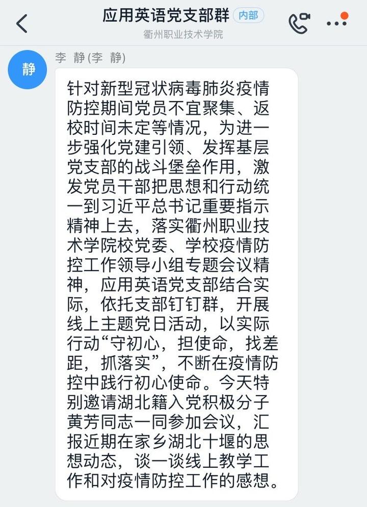 身处疫区的黄芳老师,作为一名入党积极分子,在线上向党支部作了第一季度的思想汇报。