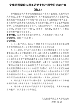 疫情就是命令,防控就是责任,一场战“疫”牵动人心。疫情面前学习不能停,应用英语党支部充分利用“互联网+党建”这个平台,组织全体党员教师认认真真、原原本本学习习近平总书记关于疫情防控的相关指示;学习上级党组织对疫情防控工作的决策部署。立足本职工作,在给员工上好专业课的同时,也要上好“众志成城抗击疫情”的思政课。充分发挥党员的先进性,提高认识,提高站位,提高觉悟。为“疫情防控,停课不停学”贡献属于我们文旅党员的一份力量。