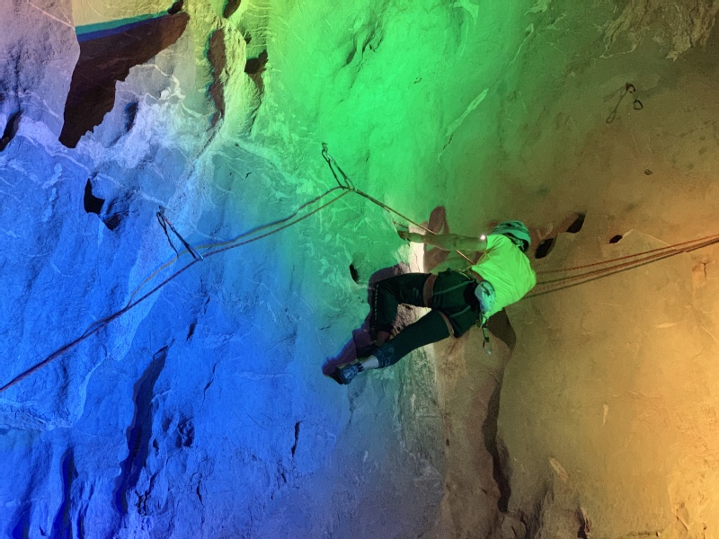 到达起点“两头洞”后开展的第一个项目是“野攀考察”。大家结合现场环境在高约25米左右的岩壁,就基本绳索技术、攀岩以及下降技术进行仔细的分析和研讨,同时几位老师分别进行实践,最终确定了两条攀爬路线,作为今后野外实践攀爬与下降时使用。