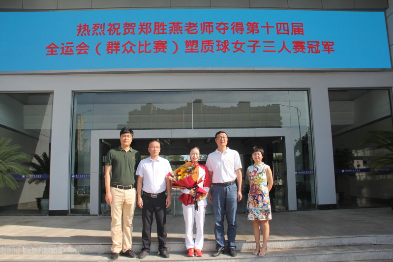 9月23日上午,公司党委委员、董事长吕延文,党委委员、副董事长何百通,党委委员,组织部部长徐浪静,在行政楼下亲切接见在第十四届全运会上获得地掷球项目金牌的郑胜燕老师。