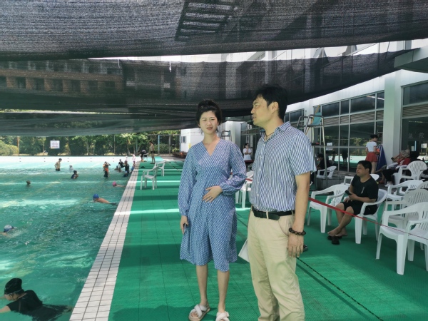 在游泳池,郭大勇经理与游泳池负责人开展交谈,他指出在组织好培训的同时,每天做好人员进出的查验工作,确保培训工作的有序与安全。