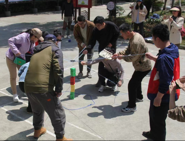 在池淮村运动广场,老师们分成两组开展了神笔马良、合力搭建两个趣味活动。大家齐心协力,共建“高塔”,书写“以体育人”。