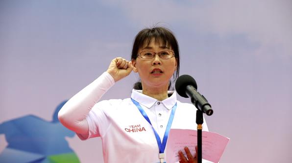 地掷球国家一级裁判员徐惠芳代表全体裁判员宣誓。