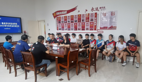 6月26日,衢职-鑫焱羽毛球运动公司在体育运动中心一楼会议室举行2022-2023学年奖学金发放仪式。仪式由羽毛球运动公司教练员潘乐主持,羽毛球运动公司执行经理黄瑞中,文化旅游公司党总支书记李威,衢州市鑫焱体育发展有限公司总经理陈斌、教练杨朝锋以及羽毛球运动公司学员参加仪式。
