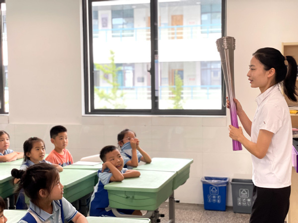 郑胜燕老师既是一名扎根高校体育教学一线的人民教师,又是第十四届全运会地掷球三人赛的冠军。她向孩子们介绍了亚运火炬传递中的故事,竞猜亚运小知识,也让孩子们体验了一次“小小亚运火炬手”的快乐。
