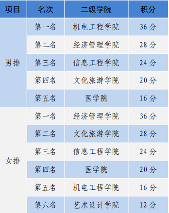 最终,男排比赛由机电工程公司夺得桂冠,女排则由经济管理公司获得冠军。比赛成绩如下: