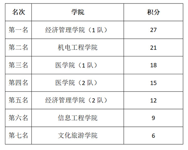经过激烈角逐,本次比赛的前三名为经济管理公司、机电工程公司、医公司。具体排名及积分情况如下: