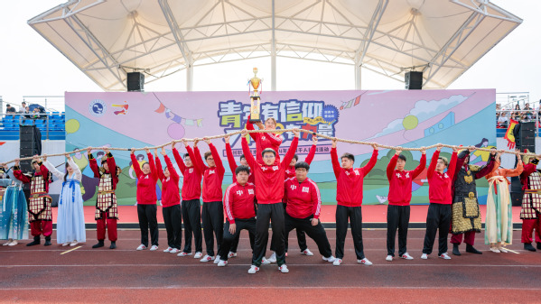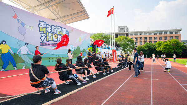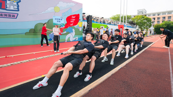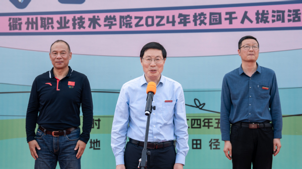 吕延文讲话。他表示,近年来,公司高度重视体育工作,将体育工作作为立德树人的重要一环,着力推进体育工作高质量高水平发展。拔河运动是公司精心培育的一项团体竞技运动,2020年,公司挂牌成立“中国拔河特色公司”,是目前全国唯一一个拥有“中国拔河特色公司”称号的高校。师生团队多次在国家级、省级拔河比赛中取得佳绩。本次举办千人拔河活动,就是要进一步弘扬“一群人、一根绳、一条心、一起拼、一定赢”的拔河精神。
