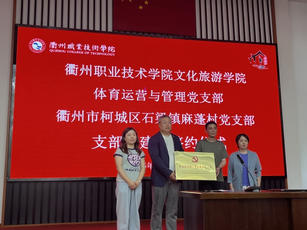 在签约仪式上,体育运营与管理党支部书记陈力全与石梁镇麻蓬村党支部书记傅建军分别代表双方签署党建联建协议,公司党委委员、组织部长周帅授牌,标志着校地双方正式“牵手”,开启深度合作新征程。